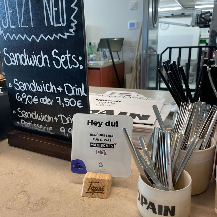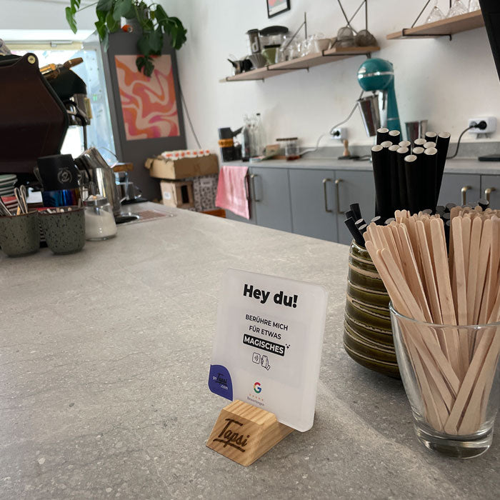 Tapsi Karte einfach aufstellen, antippen lassen – und Bewertungen sammeln. Kein Erklären, kein Aufwand, nur mehr Sterne für dein Business!