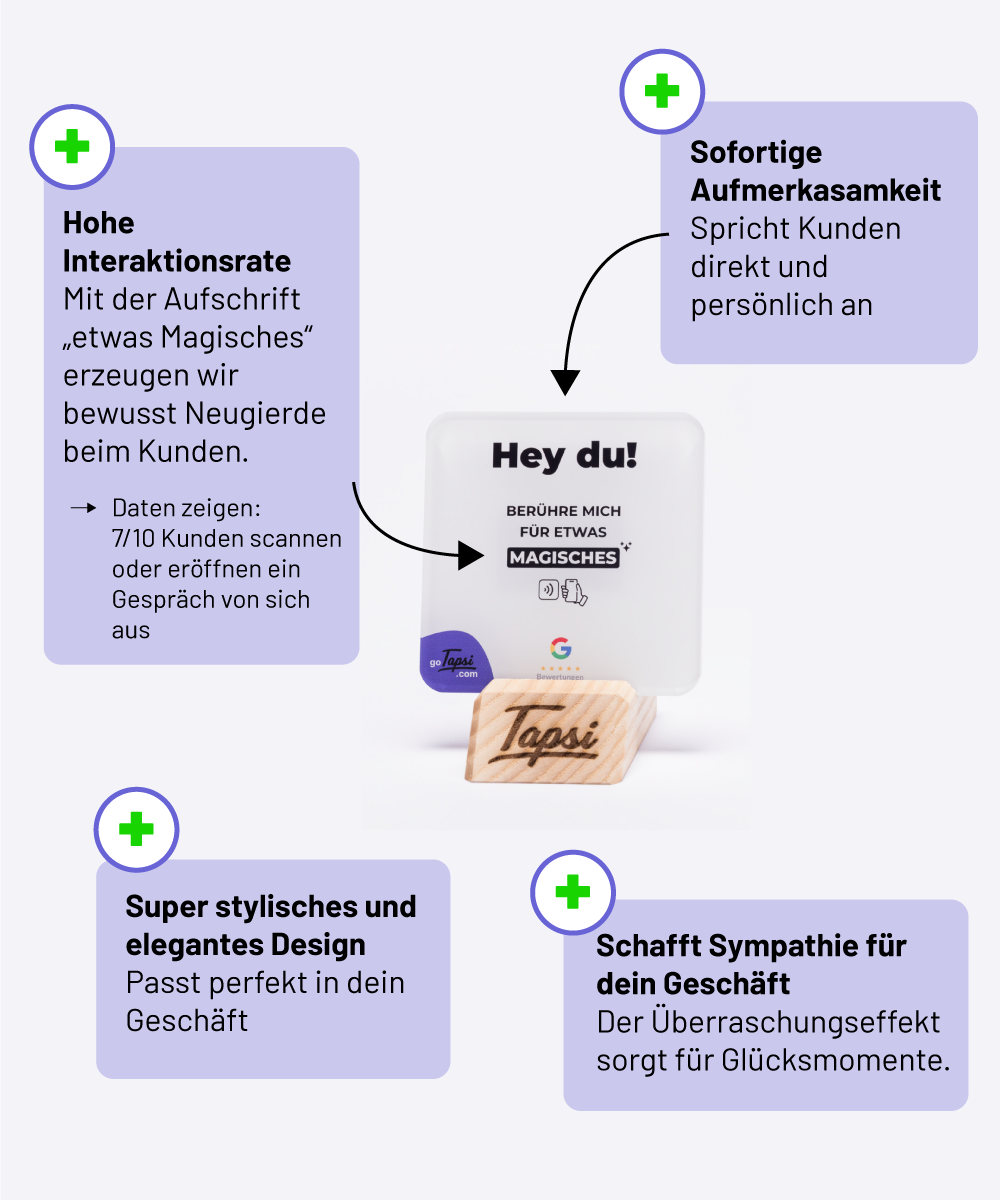 Tapsi ist nicht deine Standard NFC Bewertungskarte. Tapsi erzeugt automatisch Gespräche, durch welche zu 98% positive Bewertungen entstehen.